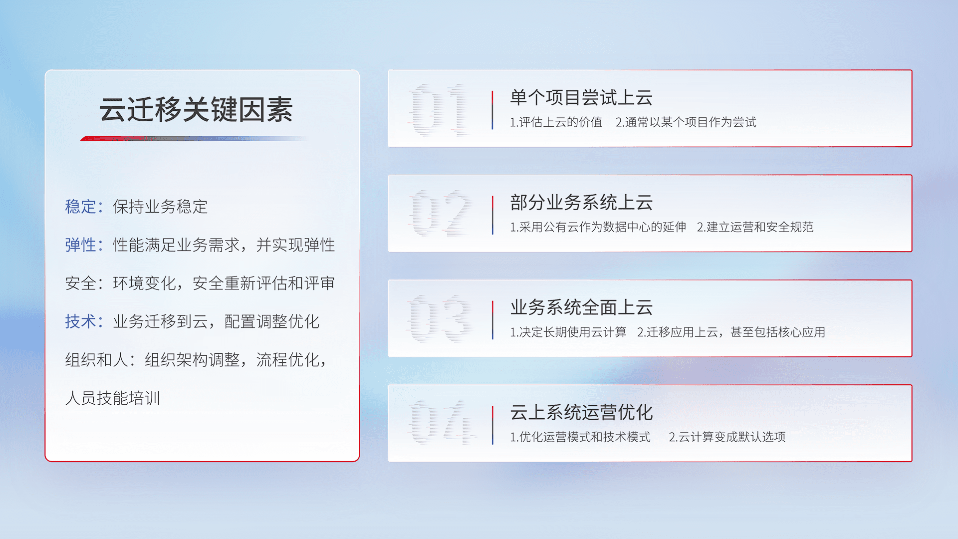 结合实际业务,,,,从规划设计、、云平台选型、、、、云原生改造、、、数据迁移、、、集成交付,,迁移全过程为客户识别最佳上云路径,,,,做好风险识别管理,,设计网络架构、、、身份权限、、、、安全审计合规、、操作审计、、、日志审计、、监控告警策略、、多站点容灾设计等,,对云上基础设施进行整体规划,,,,提升IT治理水平,,,以满足弹性、、高可用、、高性能的需求。。