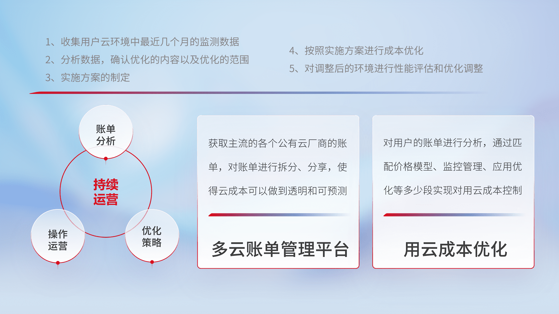 通过多云纳管,,以统一的资源数据模型把客户的云资源进行抽象和封装,,,进而实现对多云资源的统一操作,,,,保障云资源管理的可靠性、、、稳定性与可用性。。。。量身定制化运维内容,,,配置、、、开发运维、、、、补丁管理、、备份、、、、监控、、、认证和访问管理、、审计和日常巡检等,,保障在用云过程中的可靠度,,稳定度以及高可用率。。
